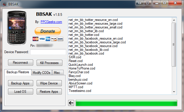 Load COD(s) allows you to install single or multiple cods from your computer to your blackberry. TO use this feature, click the Install COD(s) button choose the directoy where your COD(s) are and let BBSAK do the rest. Please note your phone may reboot after this function completes. Also note that apps installed using this function will not show up in the settings/applications menu.