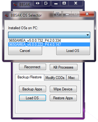 Load OS (Operating System) is a tool that allows you to install an operating system to your device. New to BBSAK 1.8.5 we have given then users the ability to select which OS you want! This even includes downgrading your OS without uninstalling newer OS's from your computer! Furthermore, to avoid confusion the OS Selector will only show you installed OS's for the device currently connected to BBSAK. This function uses the App Loader Wizard provided to us by RIM.