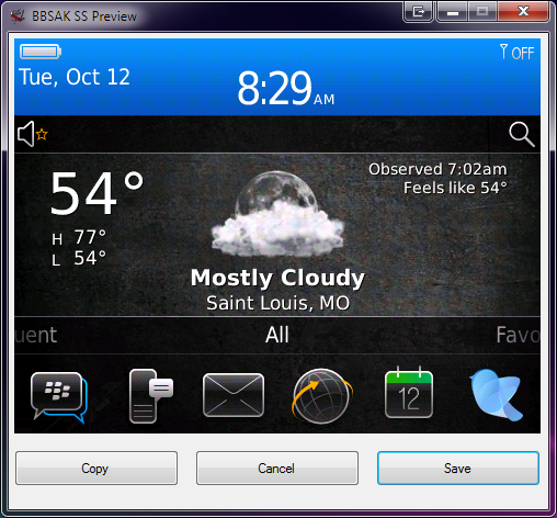 This function does exactly what it says, it takes image of your blackberry's screen. It shows a preview and allows you to Save or Copy.